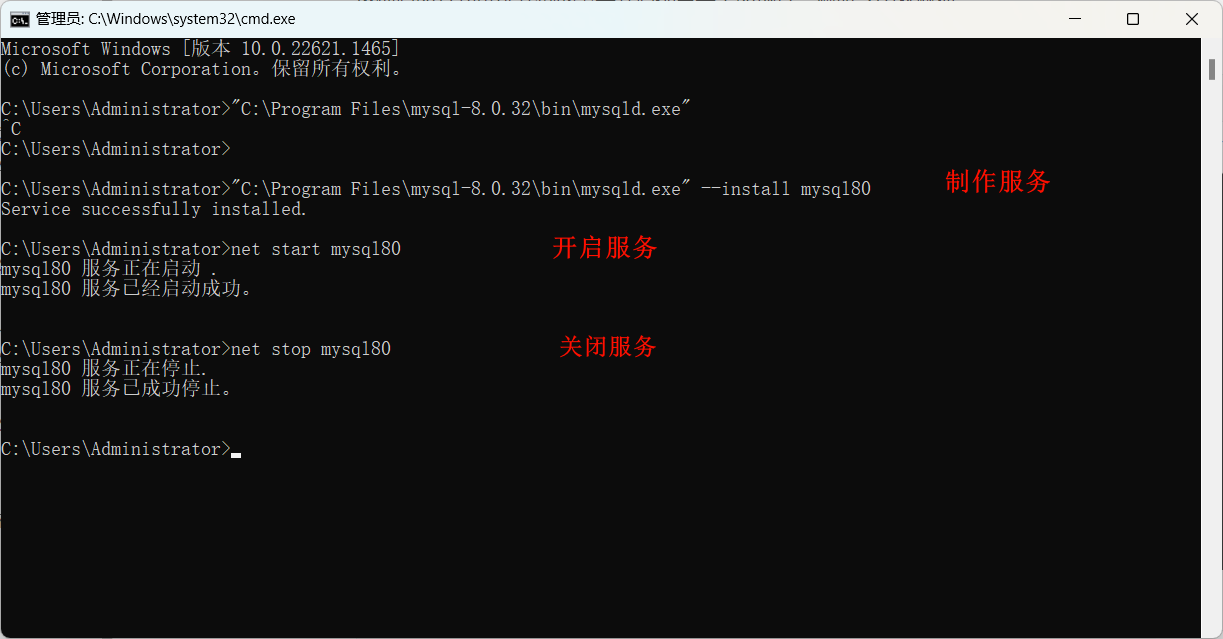 >>> "C:\Program Files\mysql-8.0.32\bin\mysqld.exe" --install mysql80