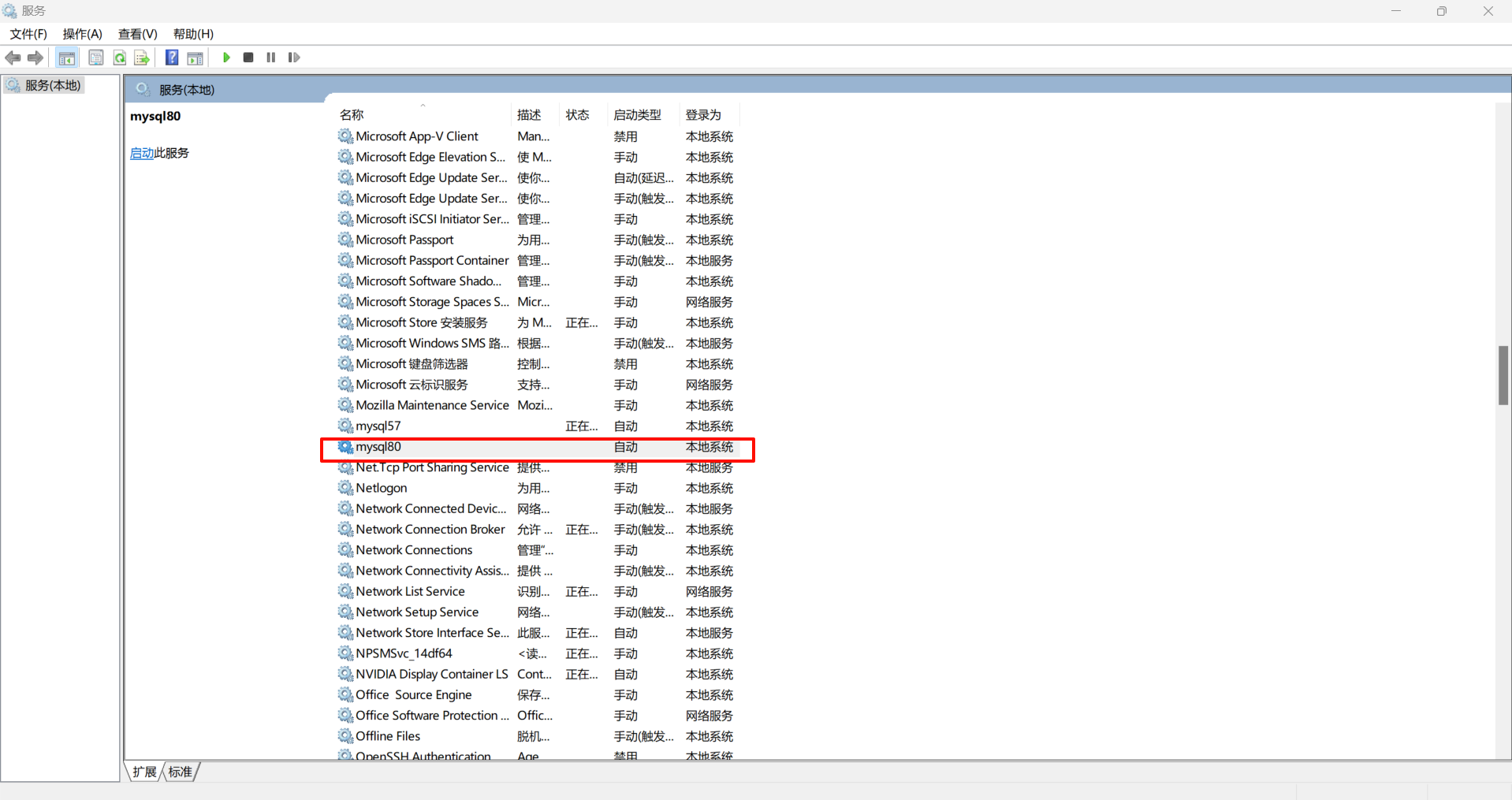 >>> net start mysql57 >>> net stop mysql57也可以在window的服务管理中点击按钮启动和关闭服务。例如: