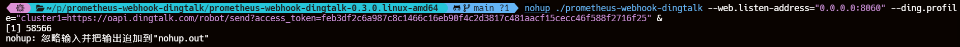 nohup ./prometheus-webhook-dingtalk --web.listen-address="0.0.0.0:8060" --ding.profile="cluster1=https://oapi.dingtalk.com/robot/send?access_token=feb3df2c6a987c8c1466c16eb90f4c2d3817c481aacf15cecc46f588f2716f25" &