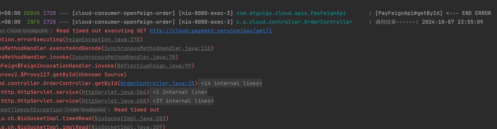在cloud-provider-payment8001模块,故意写暂停62s程序,order模块,写捕捉异常,进行默认超时时间测试。