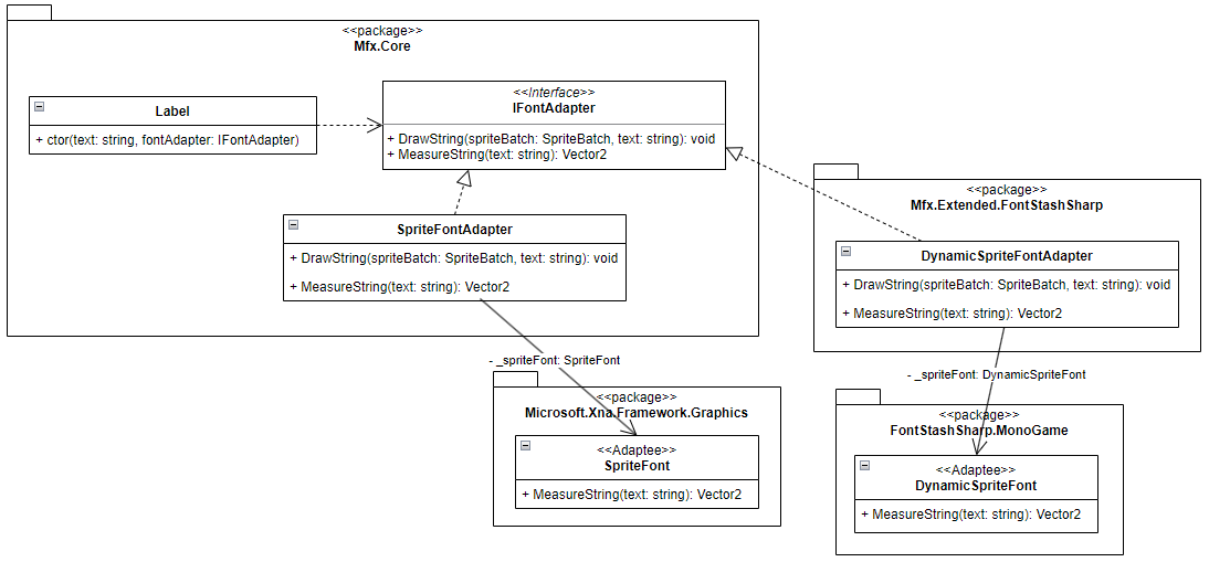 很明显,可以使用GoF95的适配器(Adapter)模式来解决目前的问题,以满足上述3的条件。为此,可以定义一个IFontAdapter接口,然后基于SpriteFont和DynamicSpriteFont来提供两种不同的适配器实现,最后,让框架里的类型(比如Label)依赖于IFontAdapter接口即可,UML类图大致如下: