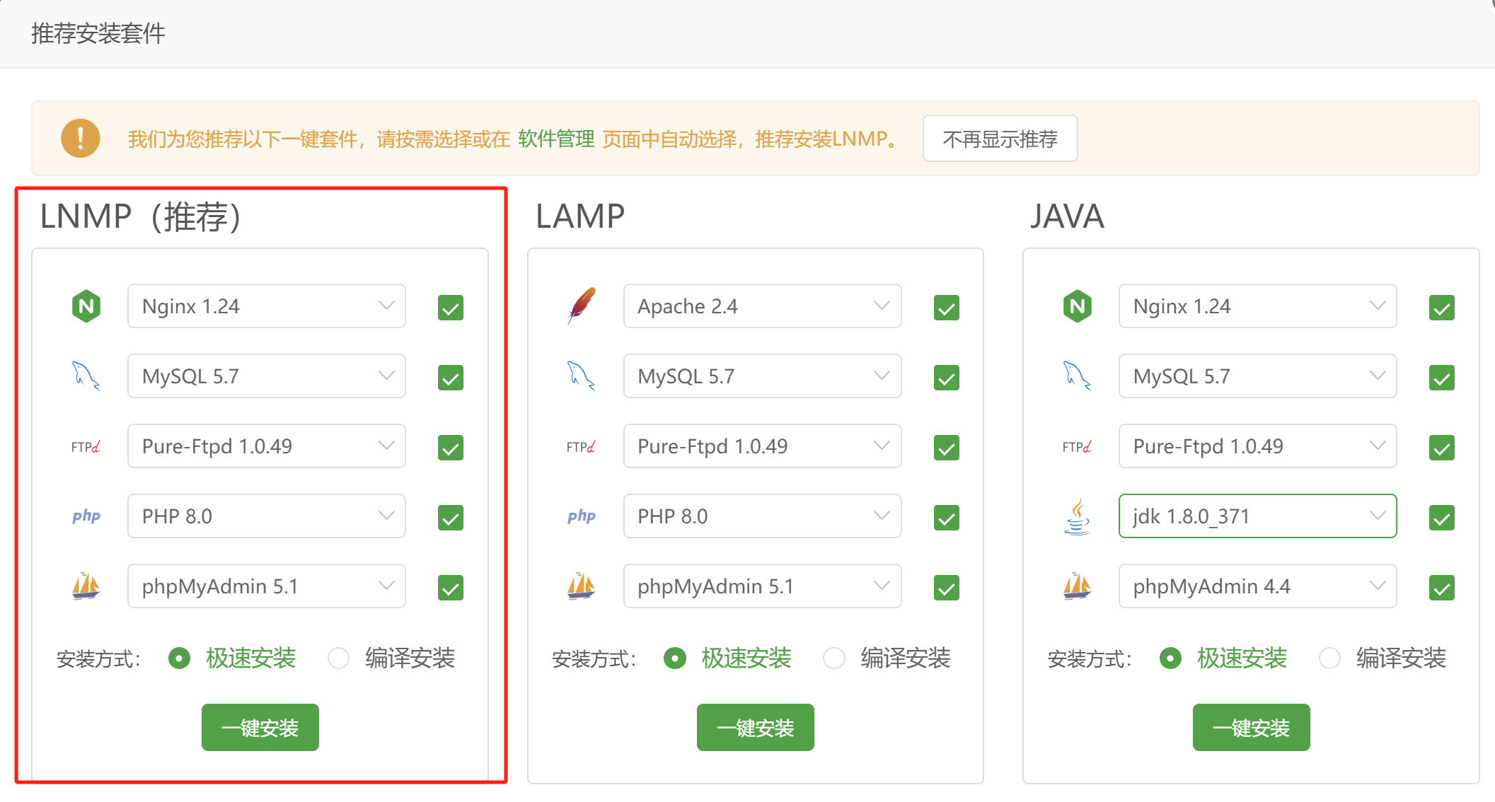 访问宝塔面板,首次进入宝塔时,会提示我们安装环境,这里推荐安装 LNMP(包含 Nginx 服务器),适合部署前后端分离的项目: