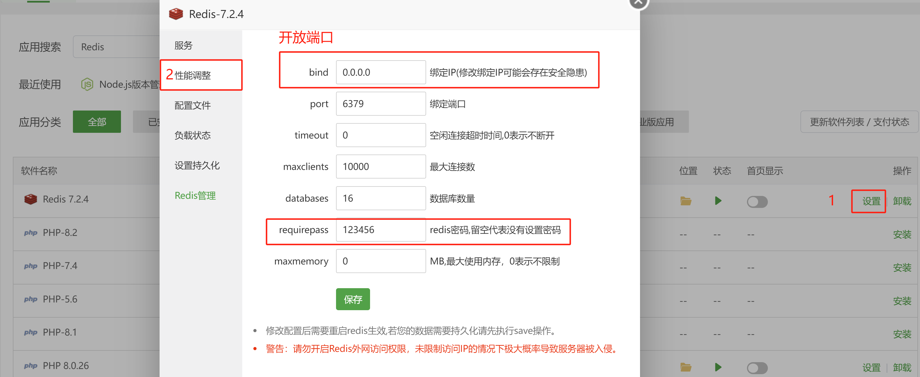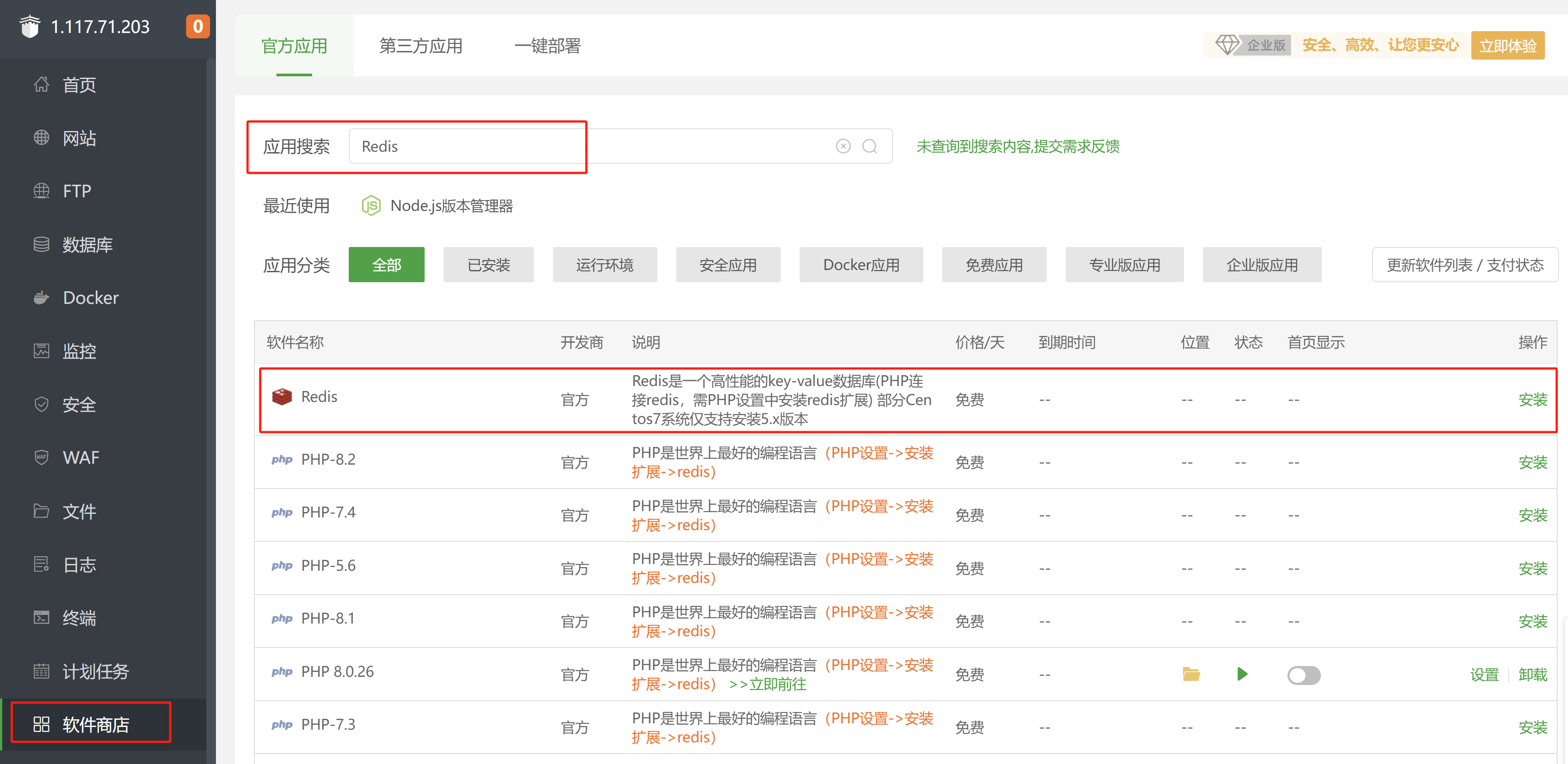 在宝塔面板的软件商店中,搜索并安装 Redis,版本选择默认的即可: