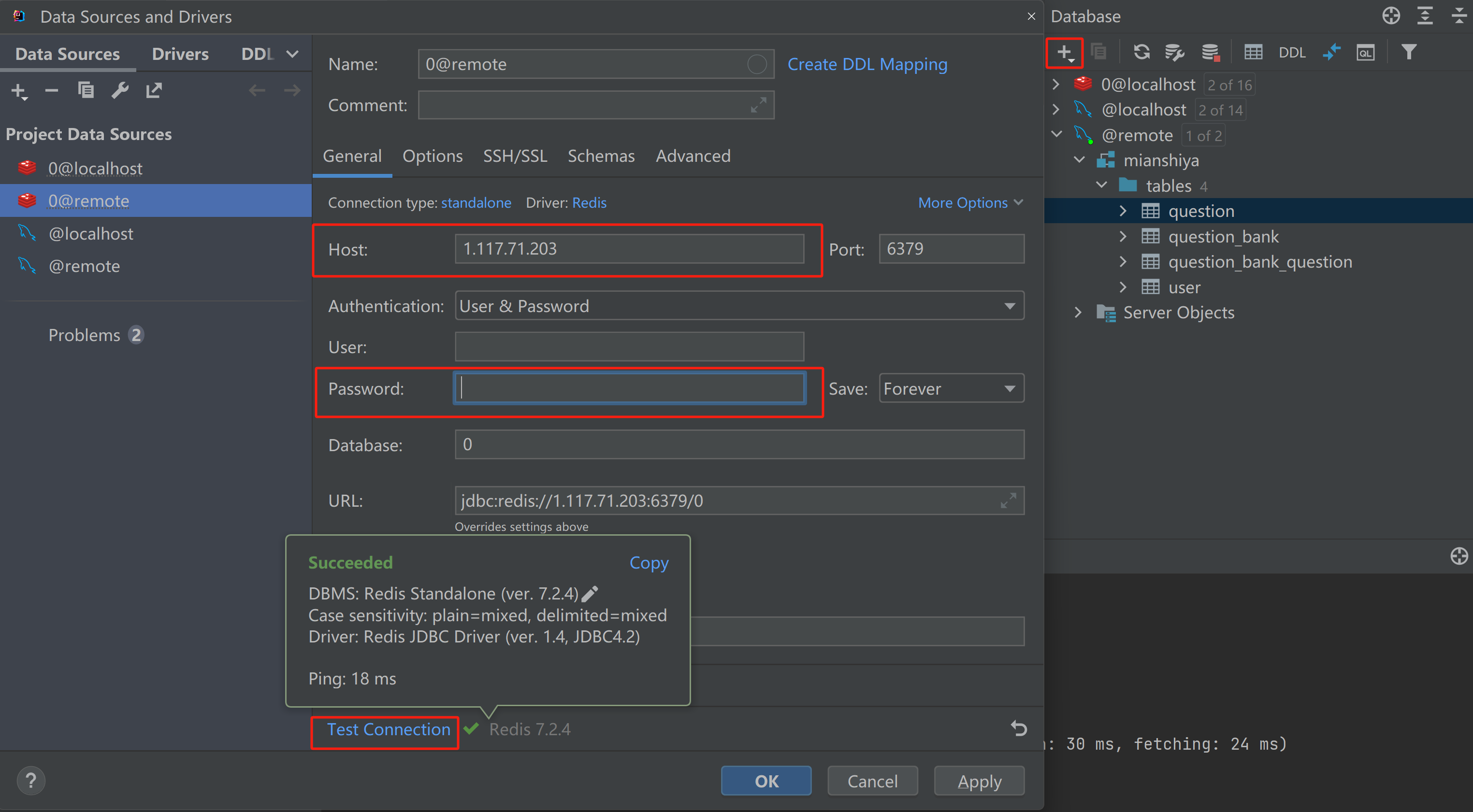 修改配置后,一定要重载配置。最后,在 IDEA 数据库面板中验证本地能否连接远程 Redis: