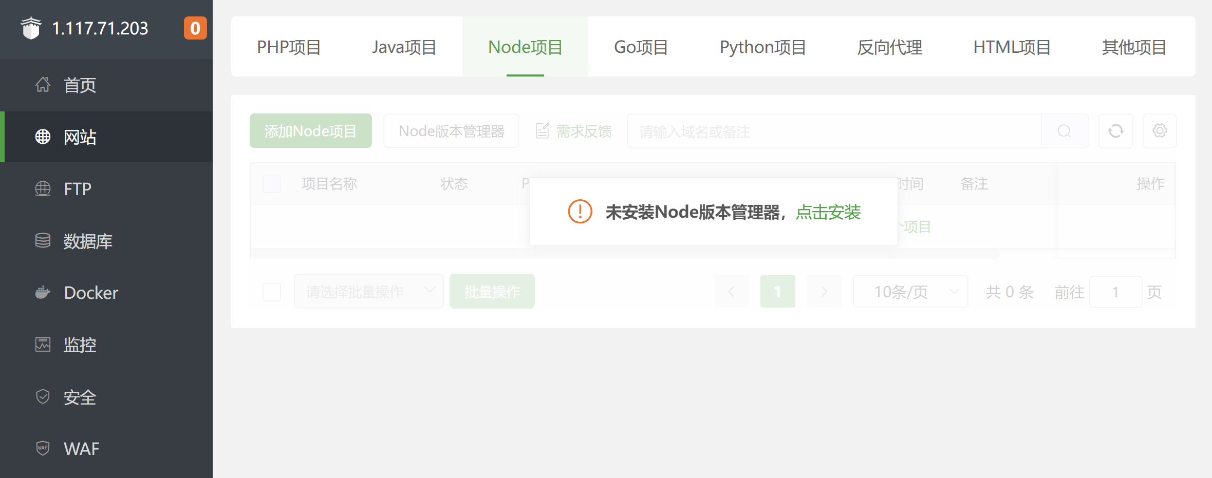 进入宝塔面板 – 网站 – Node 项目,会提示安装 Node 版本管理器,点击安装: