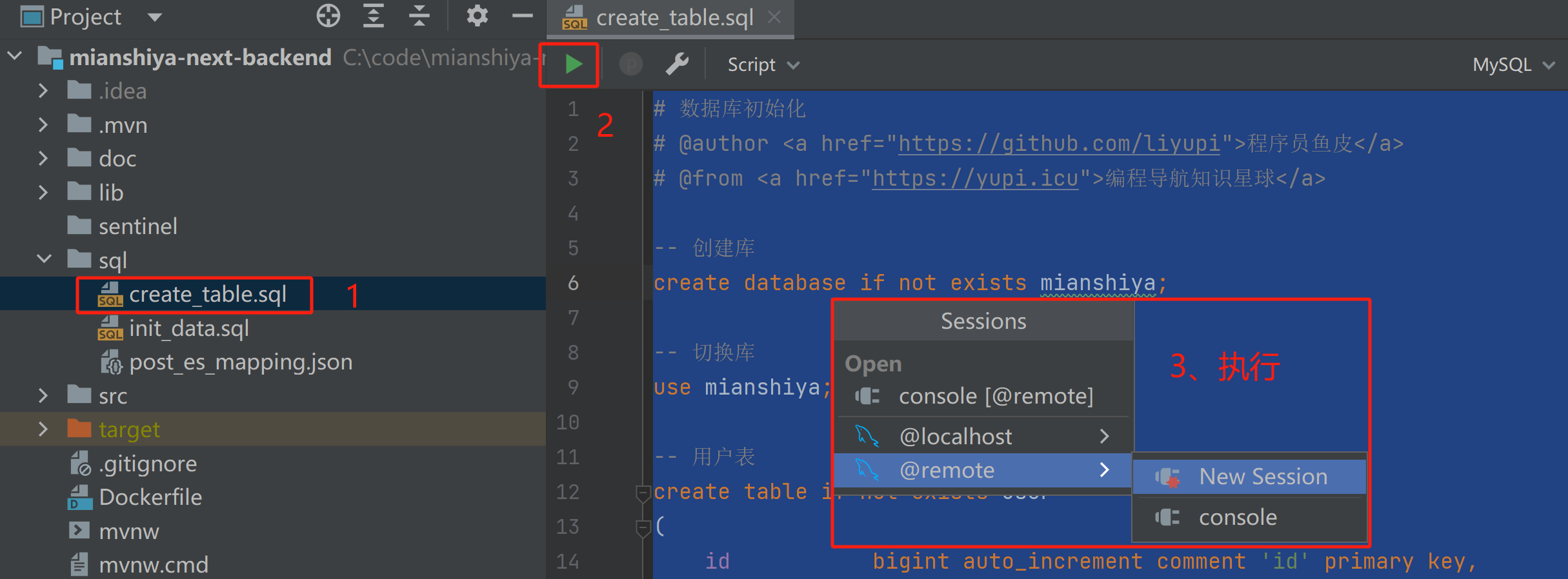 先为后端项目添加一个数据库。数据库名称和我们项目需要的数据库名称保持一致(此处为 mianshiya),注意用户名、密码和访问权限: