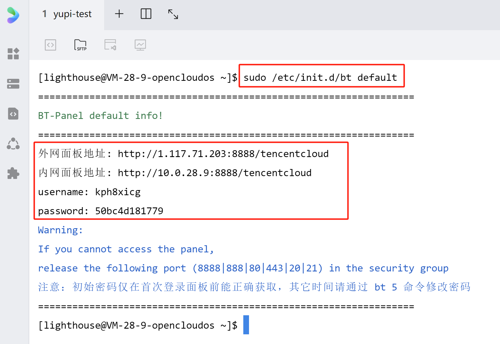 点击登录后,进入到 web 终端,复制脚本并执行,会得到初始账号密码和面板地址: