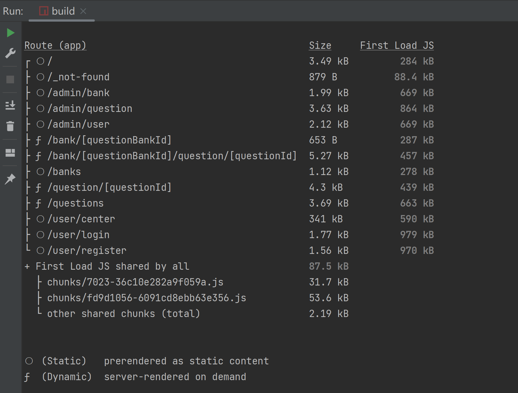 打包成功后,看到下图信息,能够很直观地看到哪些页面用到了静态渲染和服务端渲染: