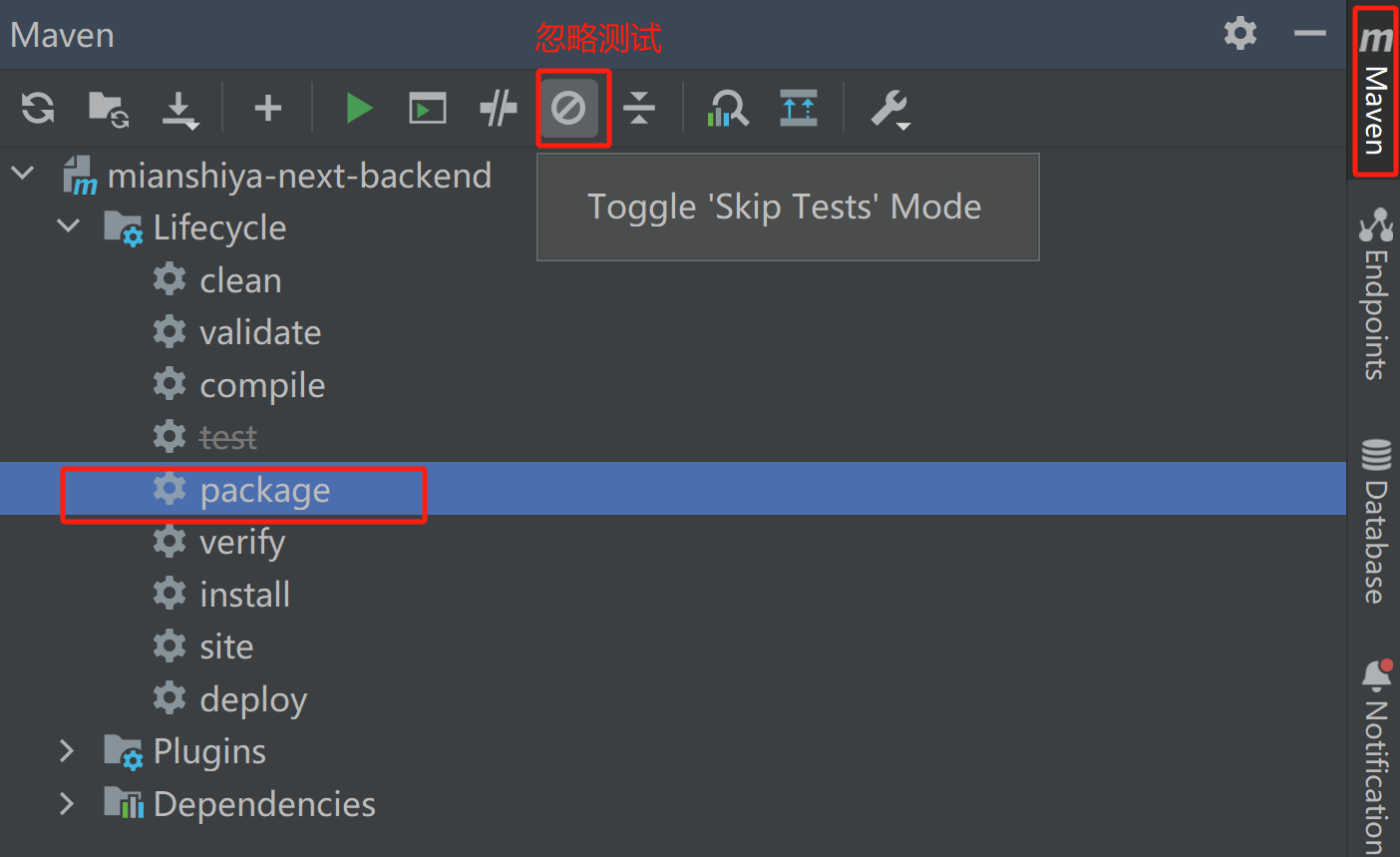 在 IDEA 中打开后端项目,忽略测试并打包: