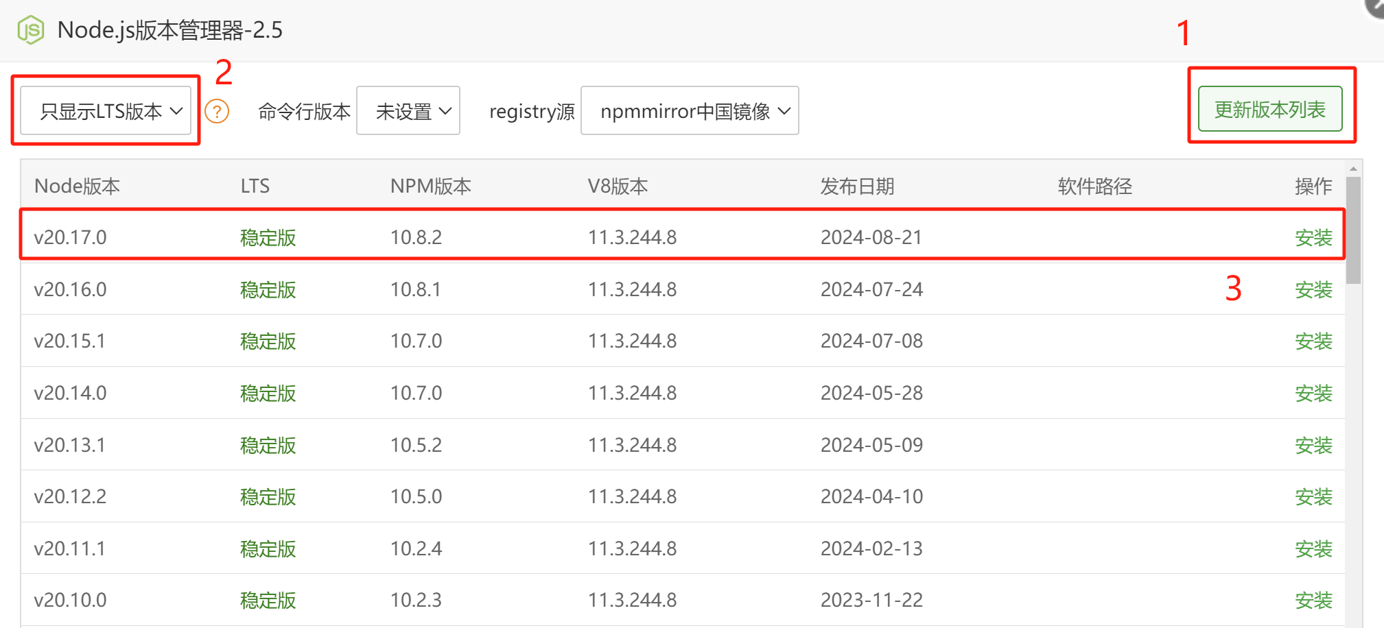 然后就可以用它来安装 Node.js 版本了,首先要更新版本列表,然后选择 > 18.18.x 的稳定版本,此处鱼皮选择 v20.17.0 安装: