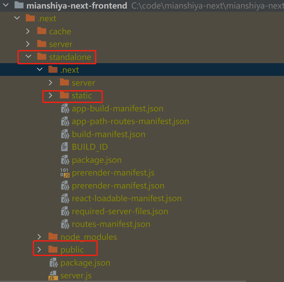 然后在 .next 目录下会生成 standalone 目录,该目录就是可以独立部署的前端包。但是必须按照如下模式组织目录,一定不能有错!