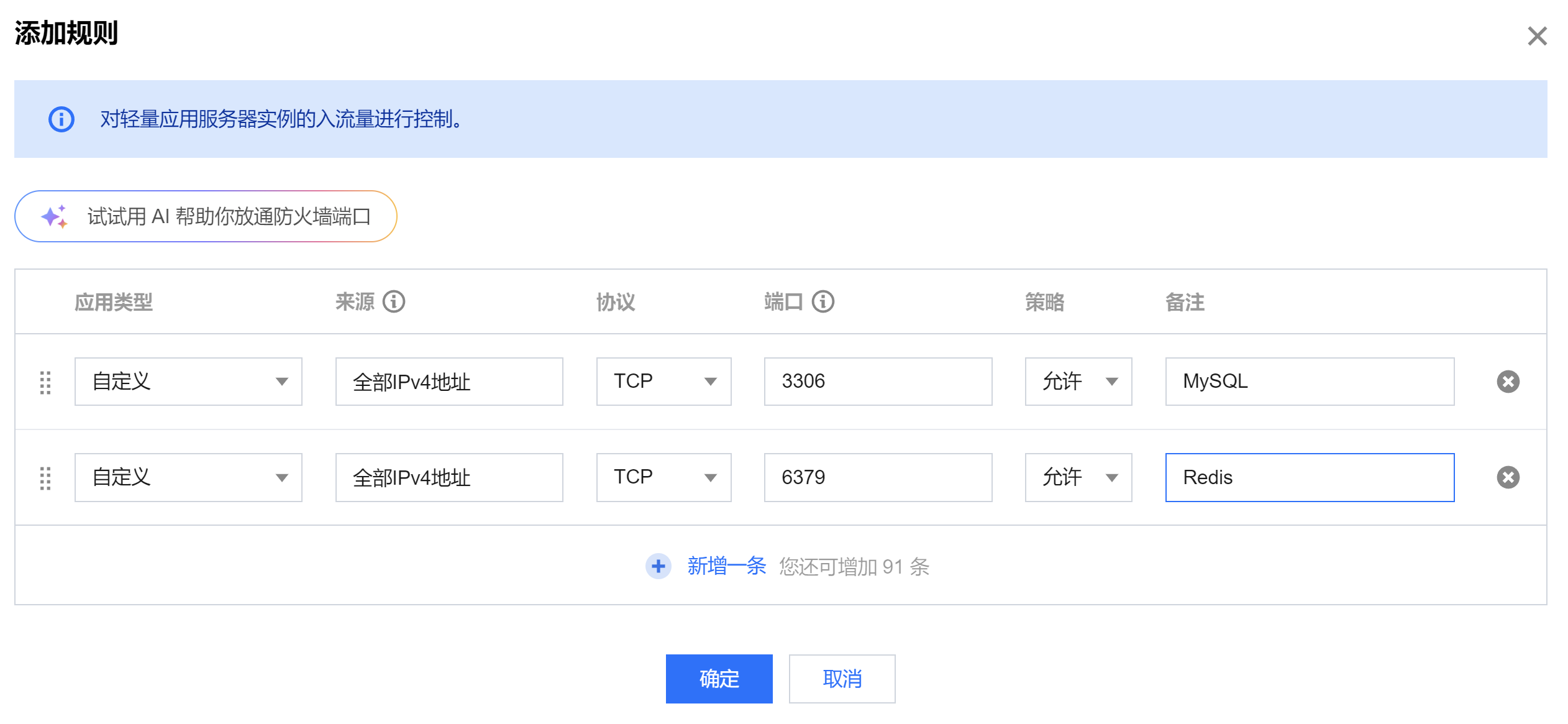 做好规划后,我们需要在腾讯云控制台的防火墙中开通需要外网访问的服务端口: