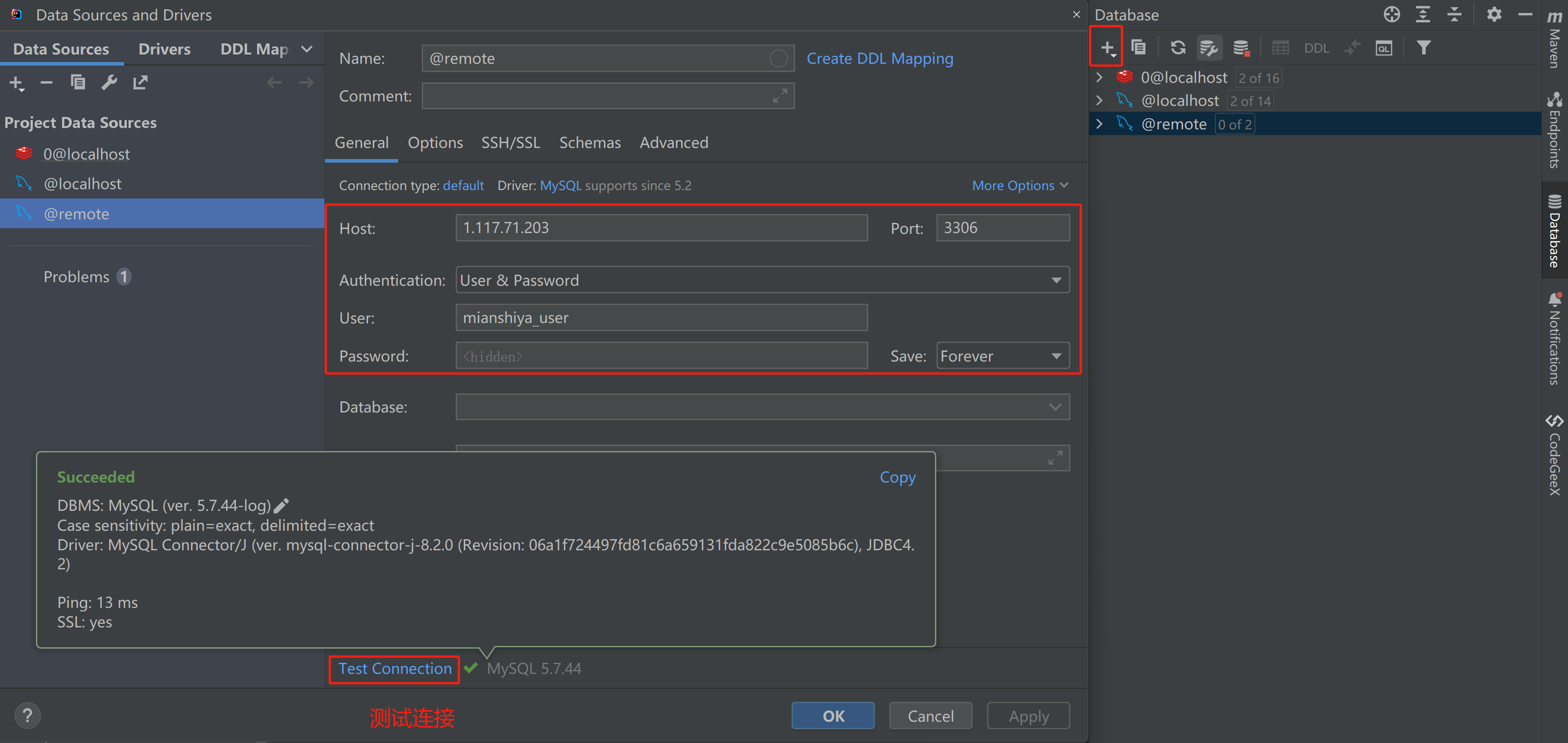 在 IDEA 中打开后端项目,通过数据库面板在本地检查连接是否正常: