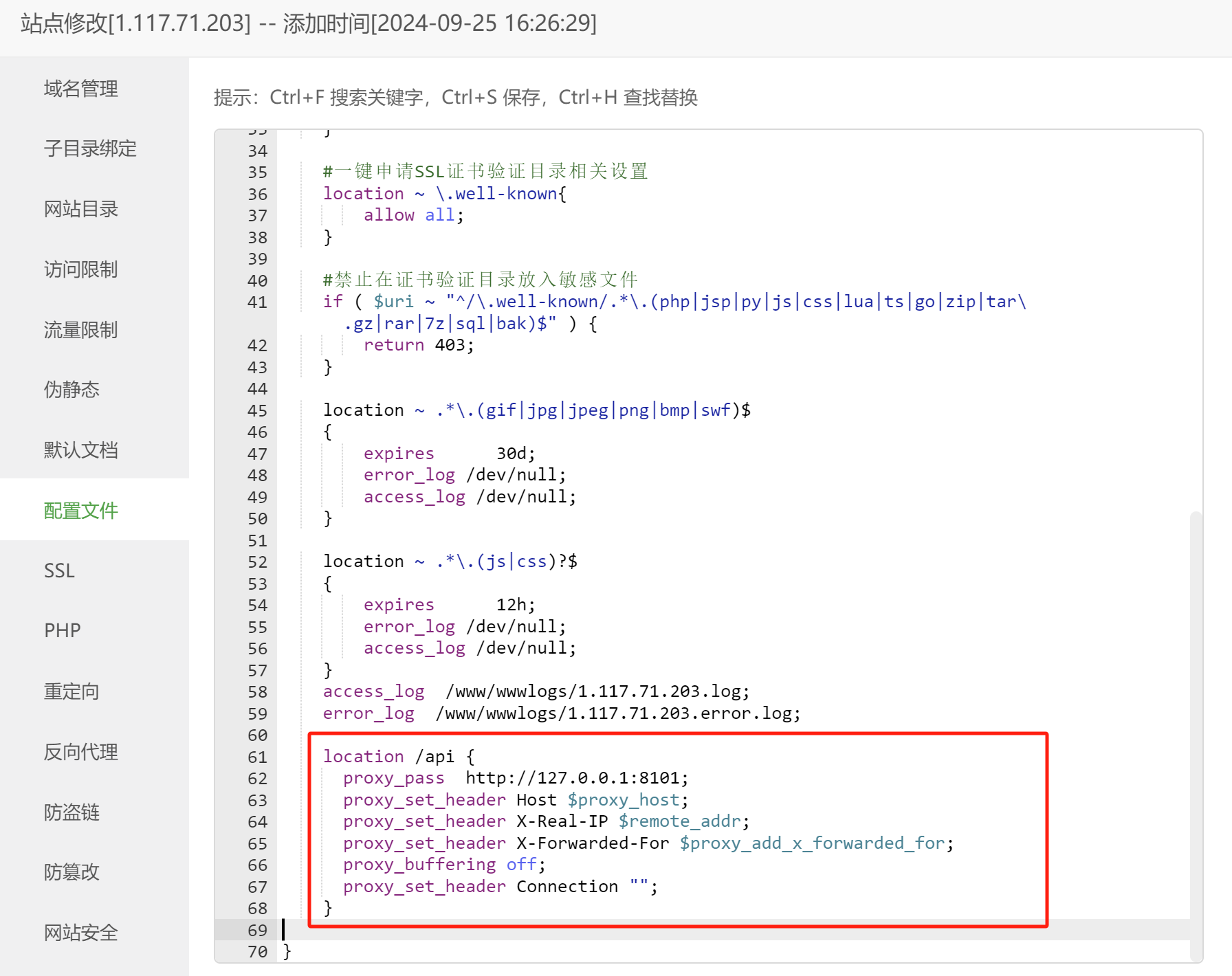 如果访问的是后端接口(地址有 /api 前缀),则 Nginx 将请求转发到后端服务,修改 Nginx 配置如图: