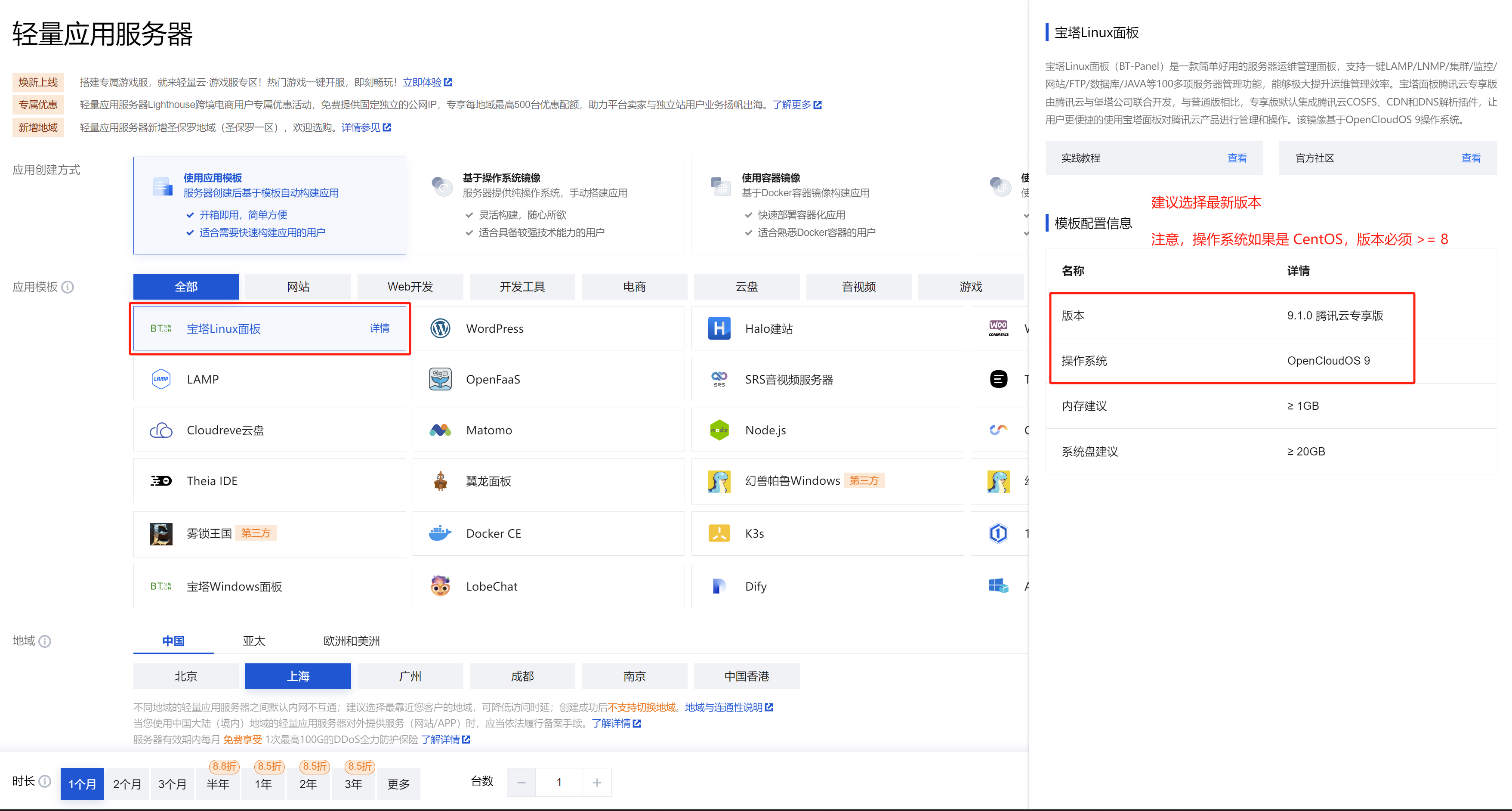 鱼皮这里选择一台预装了宝塔 Linux 应用的轻量应用服务器,配置为 2 核 2 G,部署咱们的项目(核心功能版)足够了。但一定要注意,操作系统如果是 CentOS,必须 >= 8,否则无法支持本项目的前端部署!一般选择最新版本就好了,如下图: