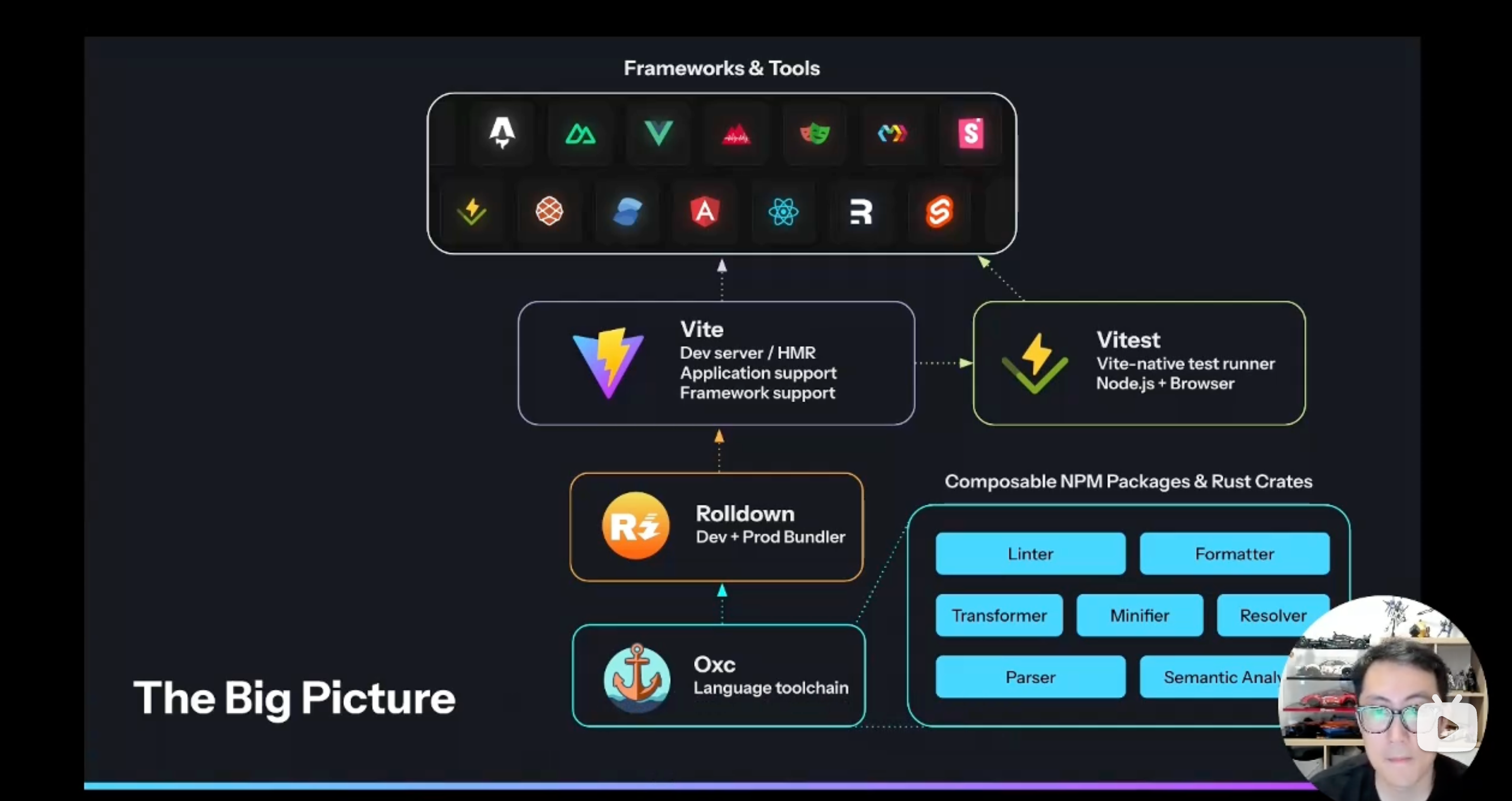 而Rolldown所扮演的角色是将 Oxc提供的这些工具整合起来,然后提供给Vite去使用。对于开发者来说无需去了解那么多工具的配置,只需要去搞清楚Vite的配置即可,大大减少了开发者的心智负担。