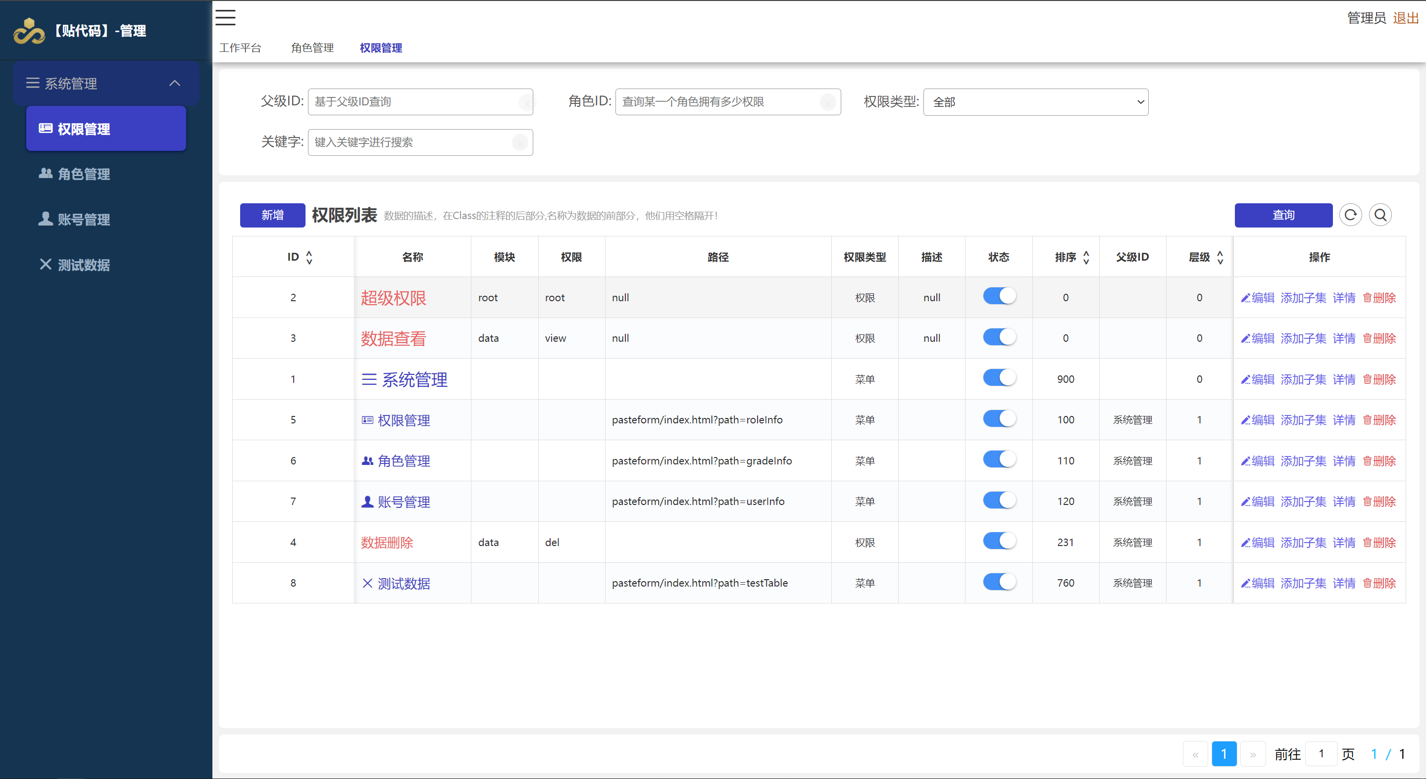 无论100个表还是30个表,在使用PasteForm模式的时候,管理端的页面是一样的,大概4个页面,