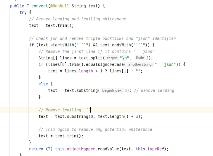 实体类在Java程序中扮演着不可或缺的角色,无论是进行内部操作,还是将数据返回给前端的RESTful接口,实体类都是业务中信息传递的核心。在Spring AI框架中,我们可以有效地控制AI的回答,以确保其能够正确映射到实体类。接下来,我们将探讨Spring AI是如何实现这一功能的,基本用法如下: