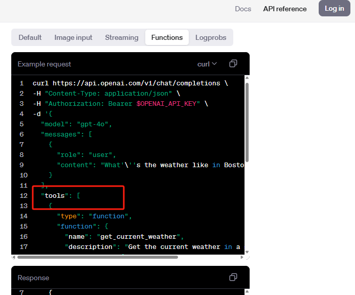 目前几乎所有第三方AI接口都提供了一个名为 tools 的参数,用于传递我们需要的参数。以OpenAI为例: