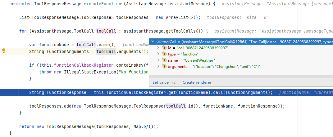 我也在这里设置了一个断点,以便大家可以清楚地看到这一过程。这一断点帮助我们确认,返回的结果完全是由 AI 生成的。在这个基础上,我们会进行进一步的判断,以决定是否需要调用函数工具。