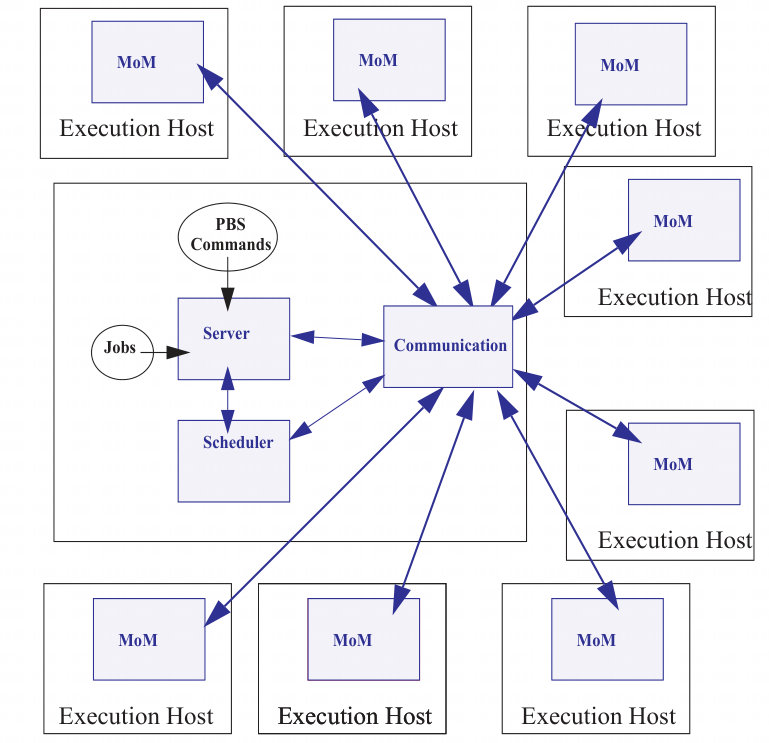 服务器、调度程序和通信守护进程在服务器主机上运行。执行作业的机器称为执行主机。每个执行主机都运行一个 MoM守护进程。服务器主机可运行 MoM 守护进程。一台服务器可管理任意数量的MoM守护进程。命令可从服务器主机、执行主机和客户端的主机运行。我们把我们把服务器、调度程序、MoM 和通信守护进程的每个实例都称为PBS complex。