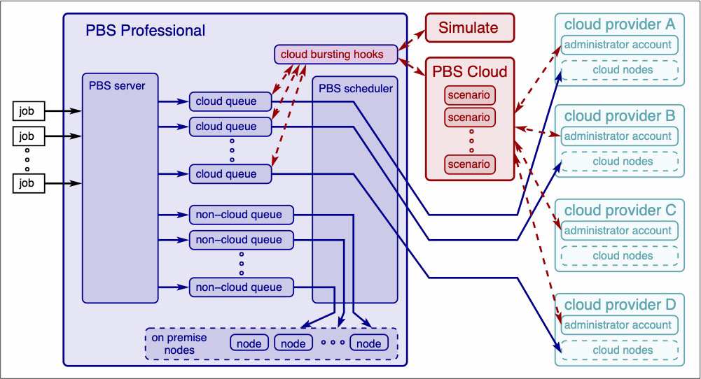 下图显示了 PBS Professional、PBS Cloud、Simulate 和云提供商之间的关系。