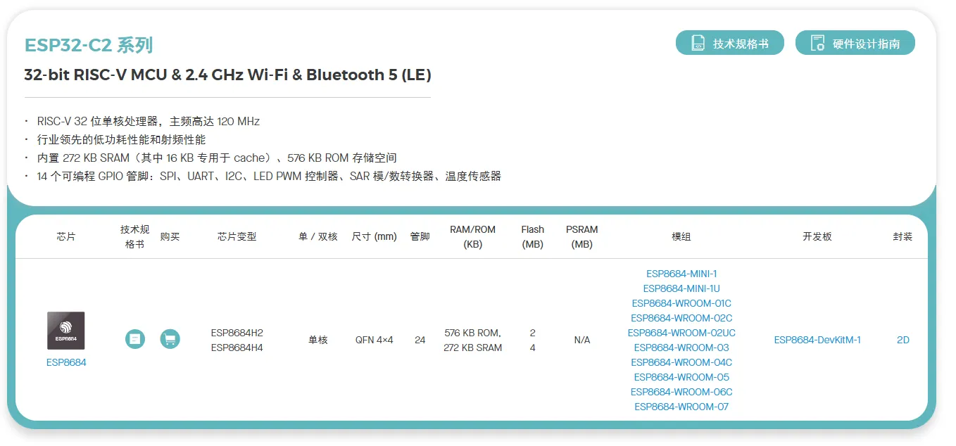 ESP32-C2 是一款小尺寸、低成本、低功耗的物联网芯片,比 ESP8266 尺寸更小,性能更强。它搭载 RISC-V 32 位单核处理器,内置 272 KB SRAM (16 KB 专用于 cache) 和 576 KB ROM,支持 2.4 GHz Wi-Fi 和 Bluetooth 5 (LE)。ESP32-C2 针对高容量、低数据速率的简单物联网应用设计,能够为插座、照明、传感器和简单的家电设备添加稳定的无线连接功能,为用户提供极具性价比的开发平台。