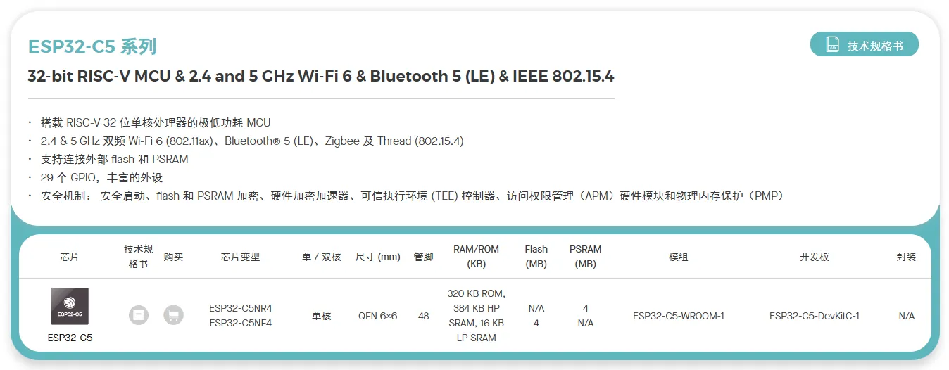 3.3 ESP32-C5(32-bit RISC-V MCU & 2.4 and 5 GHz Wi-Fi 6 & Bluetooth 5 (LE) & IEEE 802.15.4)