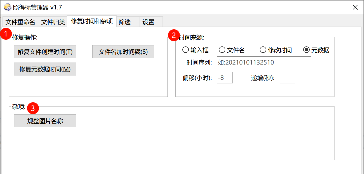 修复照片时间:由于有些照片经过网络传递后,本来的时间信息错乱了, 比如有些微信图片,文件名就是一串数字,文件中的修改时间也不是图片真实的发生时间,甚至有些图片经过网络传递后元数据也丢失了,为了方便日后的管理 ,这些图片需要重新在文件名、元数据等中恢复真实的时间。