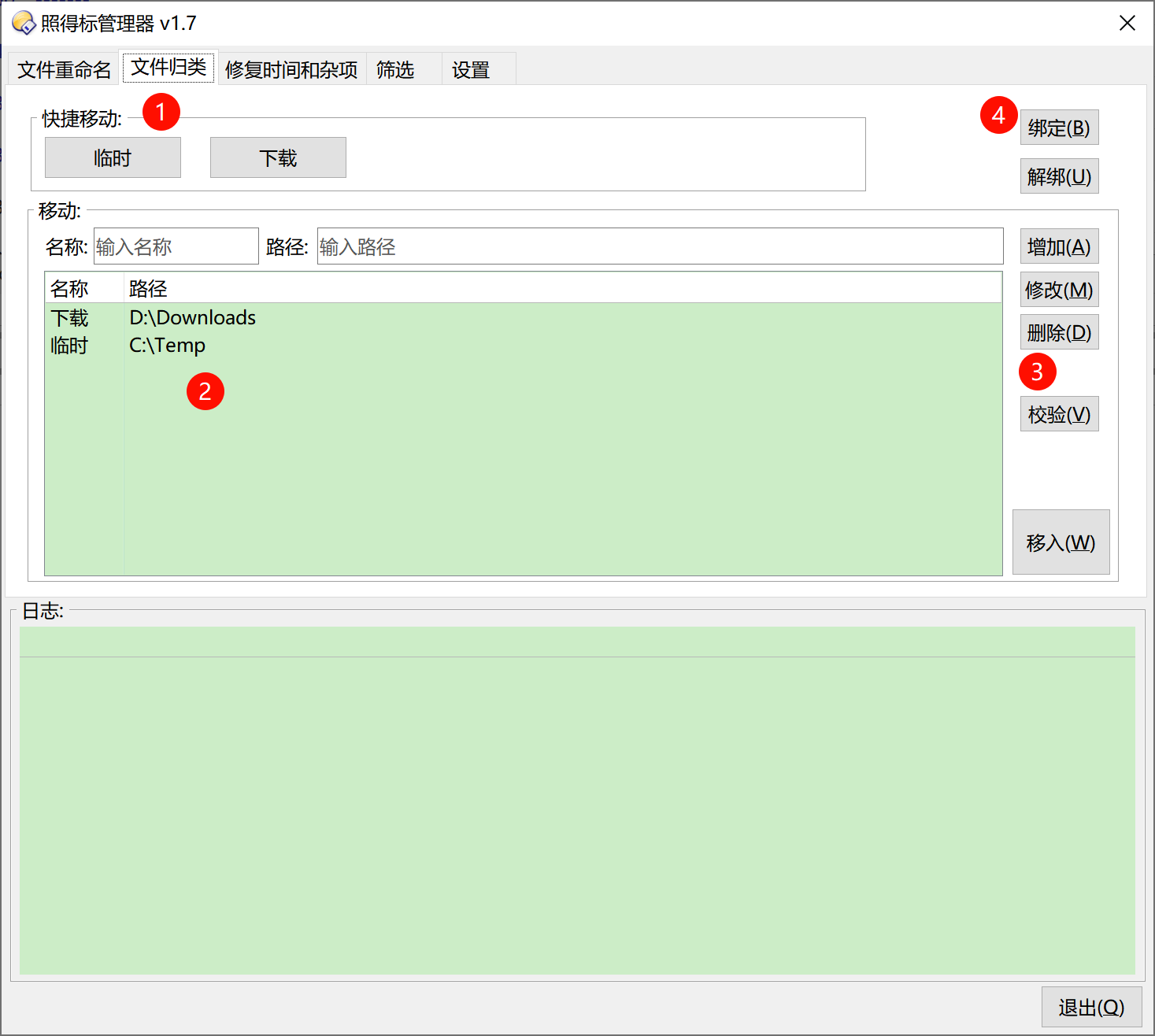 “绑定”按钮:先在路径列表中选中想要添加到快捷按钮的路径,单击“绑定”按钮,将会在“快捷移动”栏添加一个按钮。