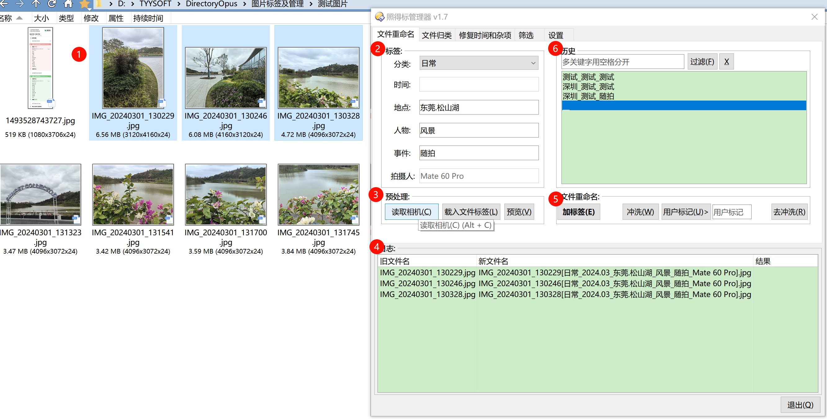 预览: DOpus的文件重命名都有预览功能,那“照得标”必须也要有,点了之后你可以在“照得标”的日志窗口提前看到更名结果。