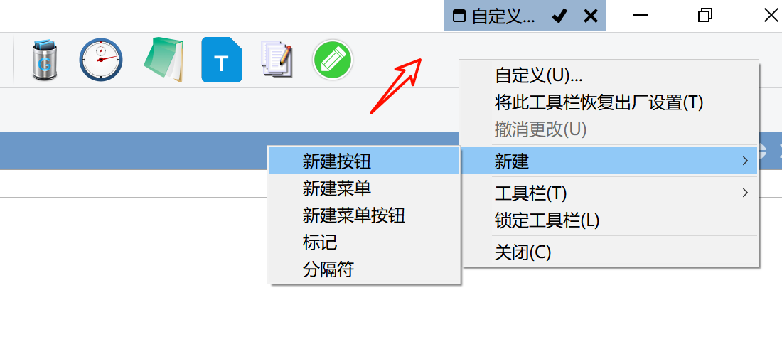 步骤3: 再次在DOpus的工具栏上单击鼠标右键,在弹出的菜单上选择“新建-> 新建按钮”,如下图所示: