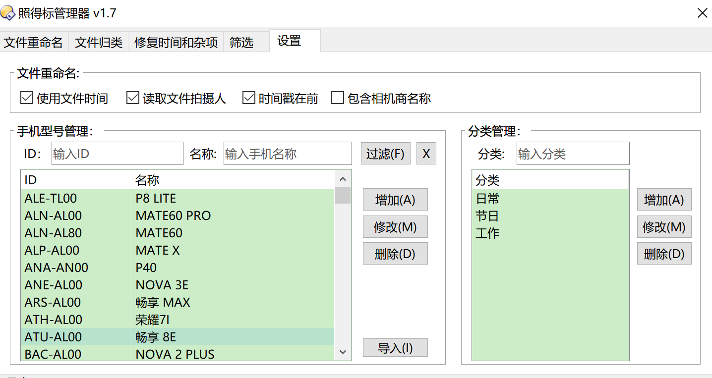 主要包含文件重命名设置、手机型号管理、分类管理,如下图所示: