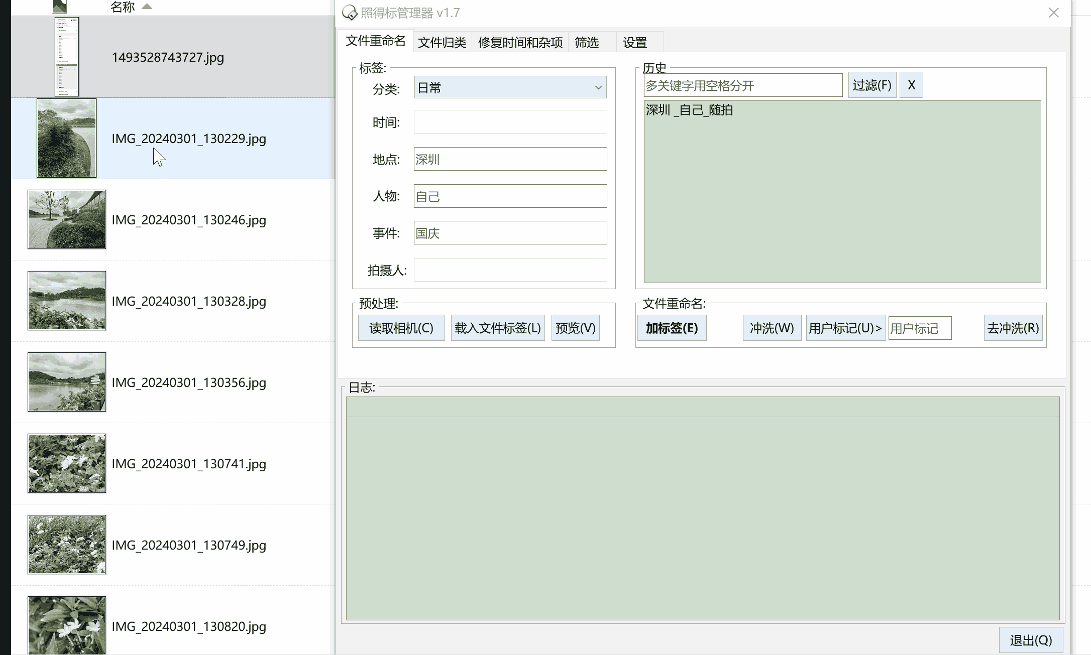 分类:照片文件名添加分类信息,比如:工作、生活、旅游、单据、发票等,分类可以在“设置”窗口中自行增删。