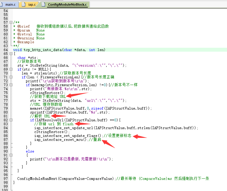 如果与自身版本号对比不一致,就把固件程序下载地址写入flash,然后设置更新标志,重启,