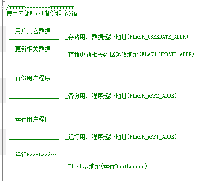 如果是使用内部flash备份程序,flash的开头存储的BootLoader程序, 结尾存储更新相关数据, 预留一些空间让用户存储其它数据