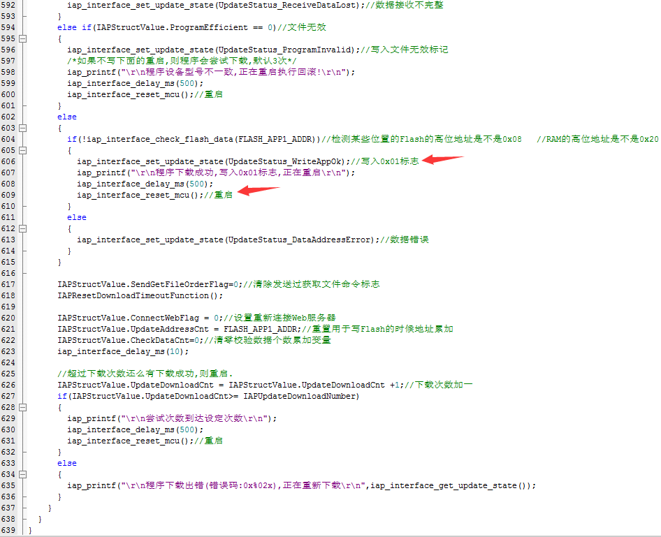 如果确实接收完了,则写入0x01状态,重启.