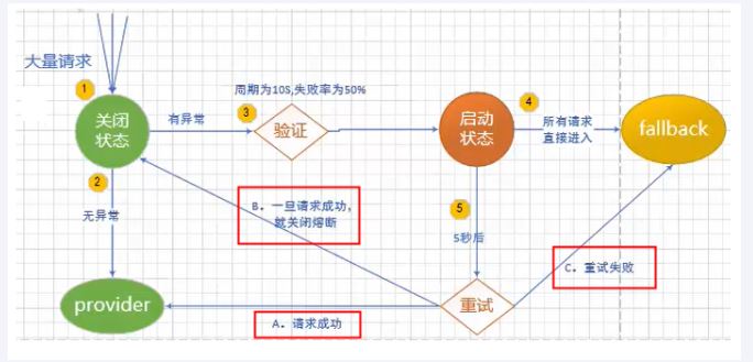 - 如果失败率超过阈值,则变为打开状态,如果失败率低于阈值,则变为关闭状态。