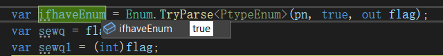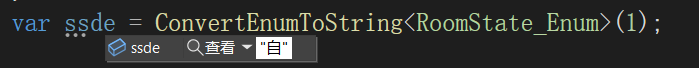 //是否存在标志 RoomState_Enum flag; //存在返回true 不存在为false //第一个参数就是要进行判断“课”是否存在枚举RoomState_Enum中 var ifhaveEnum = Enum.TryParse<RoomState_Enum>(“课”, true, out flag); //如果存在,那么flag就是对应枚举 //要得到状态值就转为int 0 //要得到名称就转string "课" var sewq = flag.Ext_IsDBNull(); var sewq1 = (int)flag;