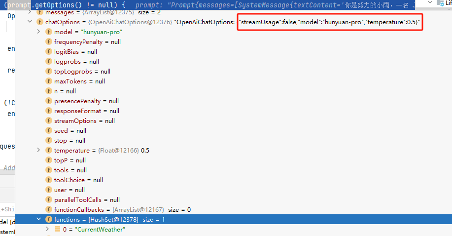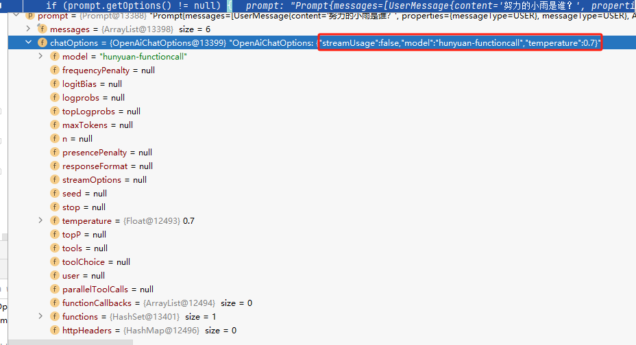 如图所示,在我们发起请求之前,如果提前设置一个断点,我们就能够在这一时刻查看到 chatOptions