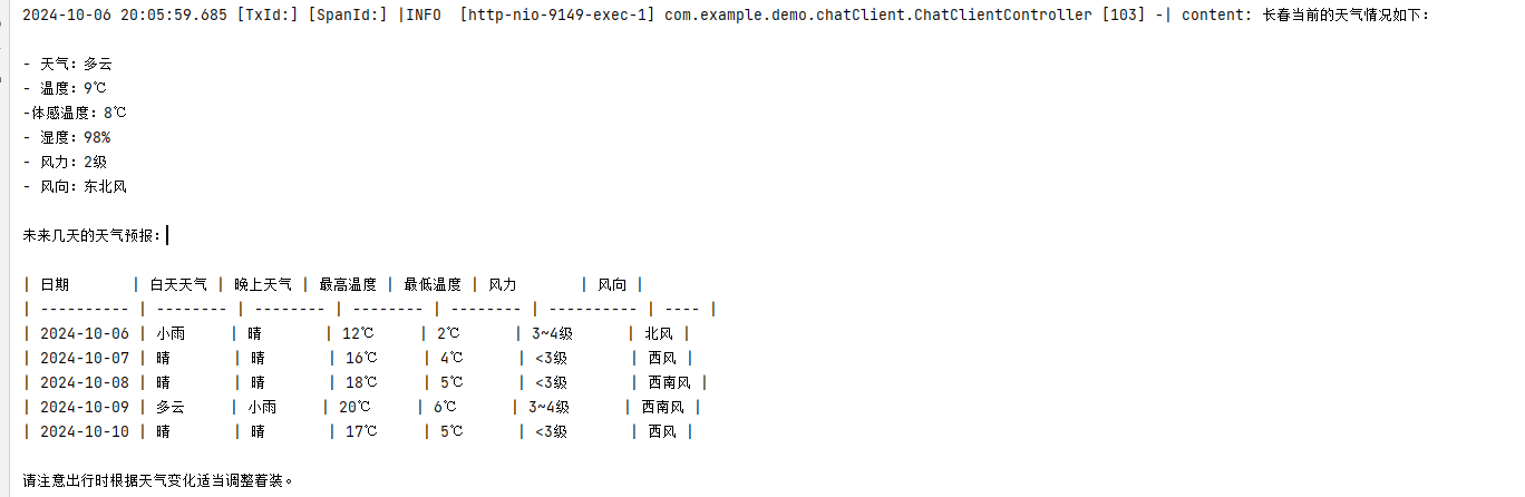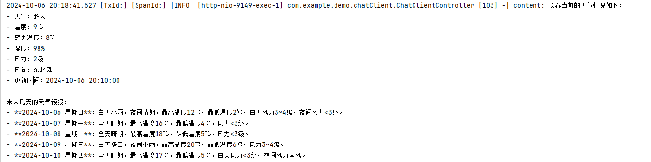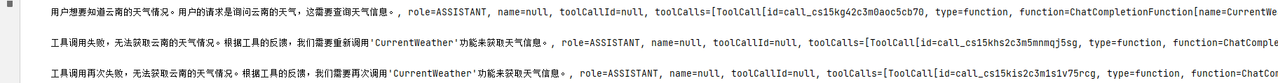 role=SYSTEM, name=null, toolCallId=null, toolCalls=null, refusal=null], ChatCompletionMessage[rawContent=长春的天气咋样?, role=USER, name=null, toolCallId=null, toolCalls=null, refusal=null], ChatCompletionMessage[rawContent=使用’CurrentWeather’功能来获取长春的天气情况。用户想要知道长春当前的天气情况。用户的请求是关于获取特定地点的天气信息,这与工具提供的’CurrentWeather’功能相匹配。
