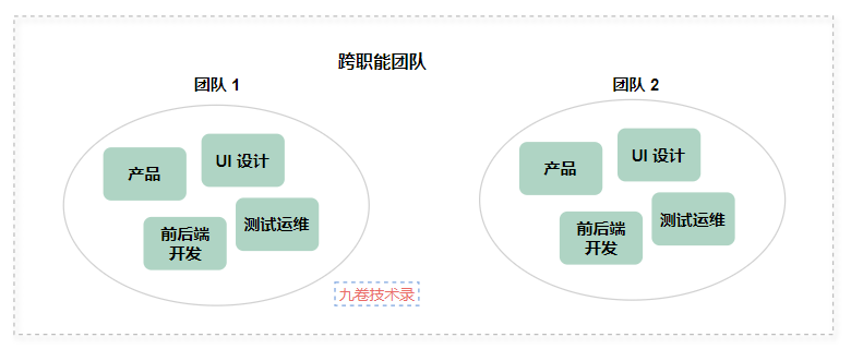 这样的团队成员组成由 产品、UI、后端开发、运维测试、交付等组成一个跨职能的全功能开发团队。