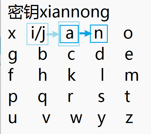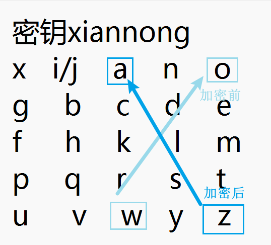 print("配对的2个明文字母在不同行,不同列,配对字母各自所在行作为本方密文字母所在行,将配对字母各自所在列作为对方密文字母所在列:\n")
