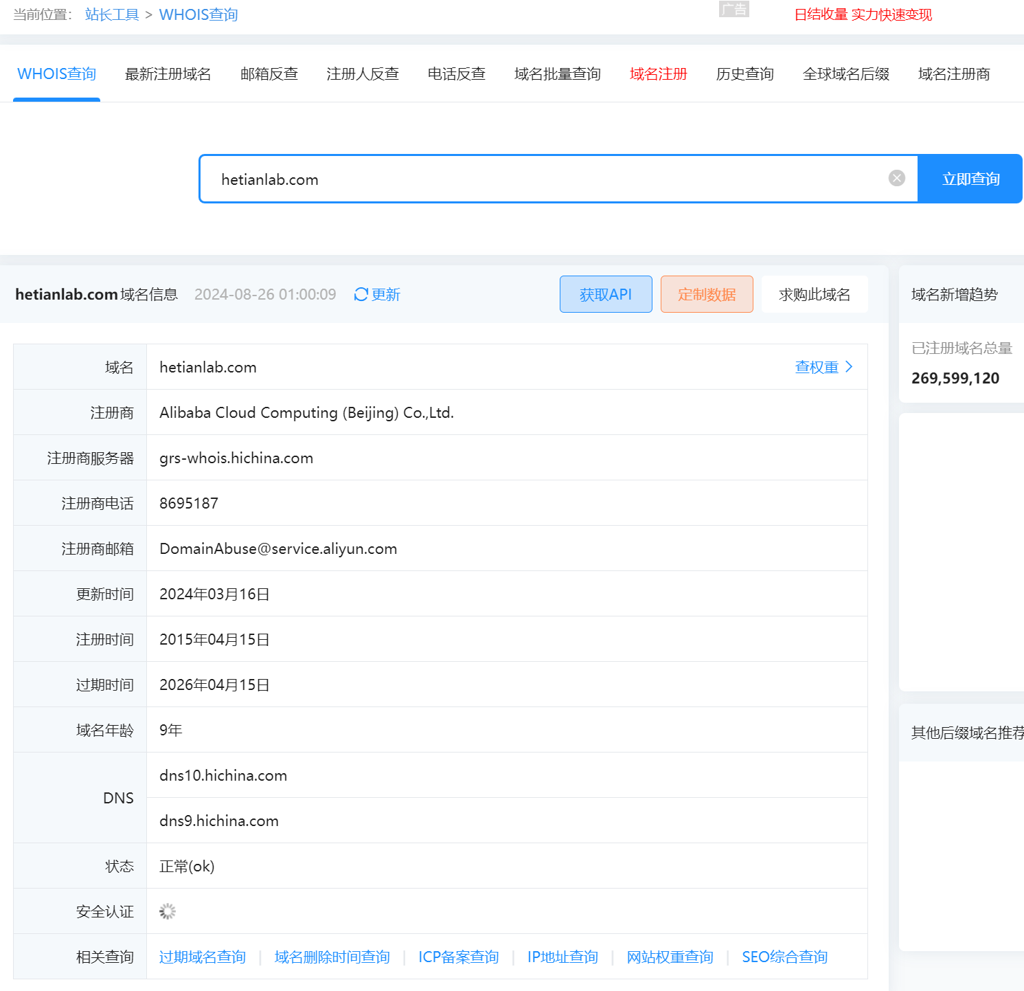 2.站长工具也提供whois服务 https://whois.chinaz.com