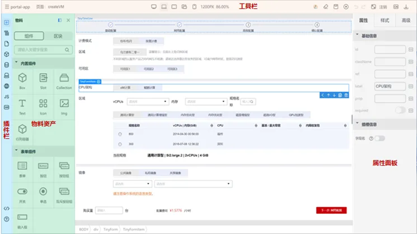 TinyEngine引擎使用插件化架构,功能模块都由一个个插件构成,例如图片中页面上方的工具栏、左侧的插件栏、右侧的属性配置栏,以及中间的画布区域,都由一个个插件构成,通过插件化的架构,可以灵活配置、自由组装出个性化的设计器。