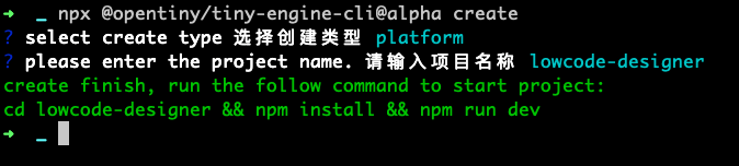 之后会提示选择要创建类型,选择platform之后,输入设计器名称,如:lowcode-designer,即可完成新设计器项目的创建。