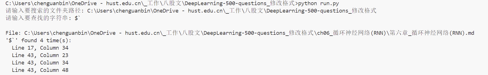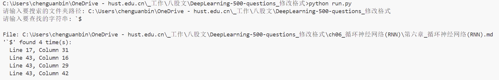 写一个代码,识别一个文件夹里的所有markdown文件,它可能是多级文件夹,某个字符串出现的位置和数目。这个字符串,比如是"eqnarray"、"`$"、"$`"。