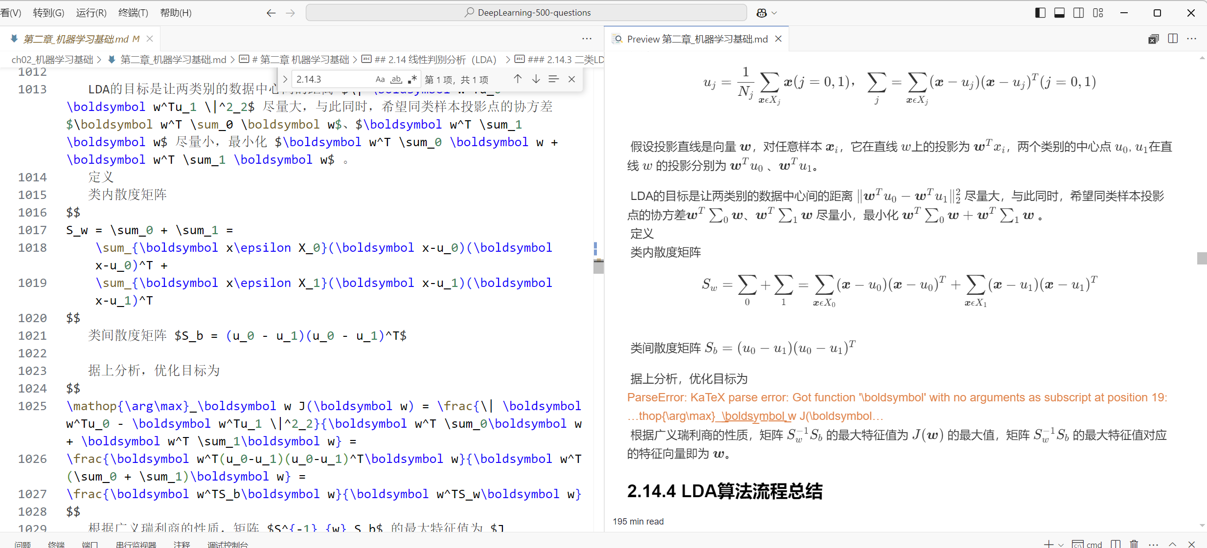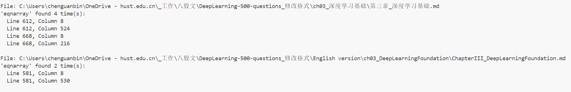 File: C:\Users\chenguanbin\OneDrive - hust.edu.cn\_工作\八股文\DeepLearning-500-questions\ch02_机器学习基础\第二章_机器学习基础.md Line 923, Column 0: '\begin{eqnarray}' -> '\begin{equation}\begin{aligned}' Line 930, Column 0: '\end{eqnarray}' -> '\end{aligned}\end{equation}' Line 948, Column 0: '\begin{eqnarray}' -> '\begin{equation}\begin{aligned}' Line 952, Column 0: '\end{eqnarray}' -> '\end{aligned}\end{equation}' Line 956, Column 0: '\begin{eqnarray}' -> '\begin{equation}\begin{aligned}' Line 961, Column 0: '\end{eqnarray}' -> '\end{aligned}\end{equation}' File: C:\Users\chenguanbin\OneDrive - hust.edu.cn\_工作\八股文\DeepLearning-500-questions\ch03_深度学习基础\第三章_深度学习基础.md Line 612, Column 1: '\begin{eqnarray}' -> '\begin{equation}\begin{aligned}' Line 612, Column 534: '\end{eqnarray}' -> '\end{aligned}\end{equation}' Line 668, Column 1: '\begin{eqnarray}' -> '\begin{equation}\begin{aligned}' Line 668, Column 226: '\end{eqnarray}' -> '\end{aligned}\end{equation}' File: C:\Users\chenguanbin\OneDrive - hust.edu.cn\_工作\八股文\DeepLearning-500-questions\ch06_循环神经网络(RNN)\第六章_循环神经网络(RNN).md Line 17, Column 31: '`$' -> '$' Line 17, Column 33: '$`' -> '$' Line 43, Column 16: '`$' -> '$' Line 43, Column 28: '`$' -> '$' Line 43, Column 40: '`$' -> '$' Line 43, Column 22: '$`' -> '$' Line 43, Column 31: '$`' -> '$' Line 43, Column 43: '$`' -> '$' File: C:\Users\chenguanbin\OneDrive - hust.edu.cn\_工作\八股文\DeepLearning-500-questions\English version\ch03_DeepLearningFoundation\ChapterIII_DeepLearningFoundation.md Line 581, Column 1: '\begin{eqnarray}' -> '\begin{equation}\begin{aligned}' Line 581, Column 540: '\end{eqnarray}' -> '\end{aligned}\end{equation}'