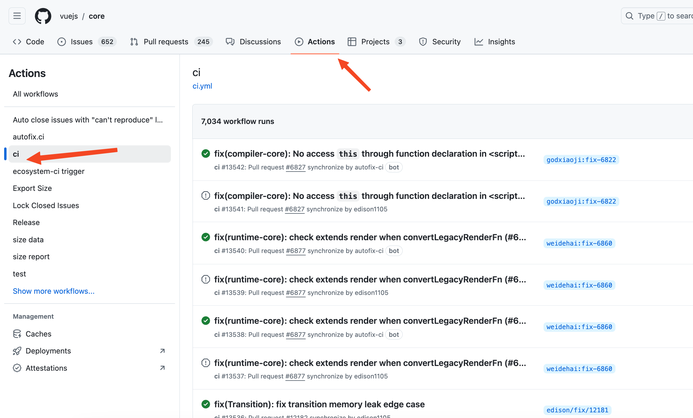 先在所有的工作流中找到名为ci的工作流,如下图: