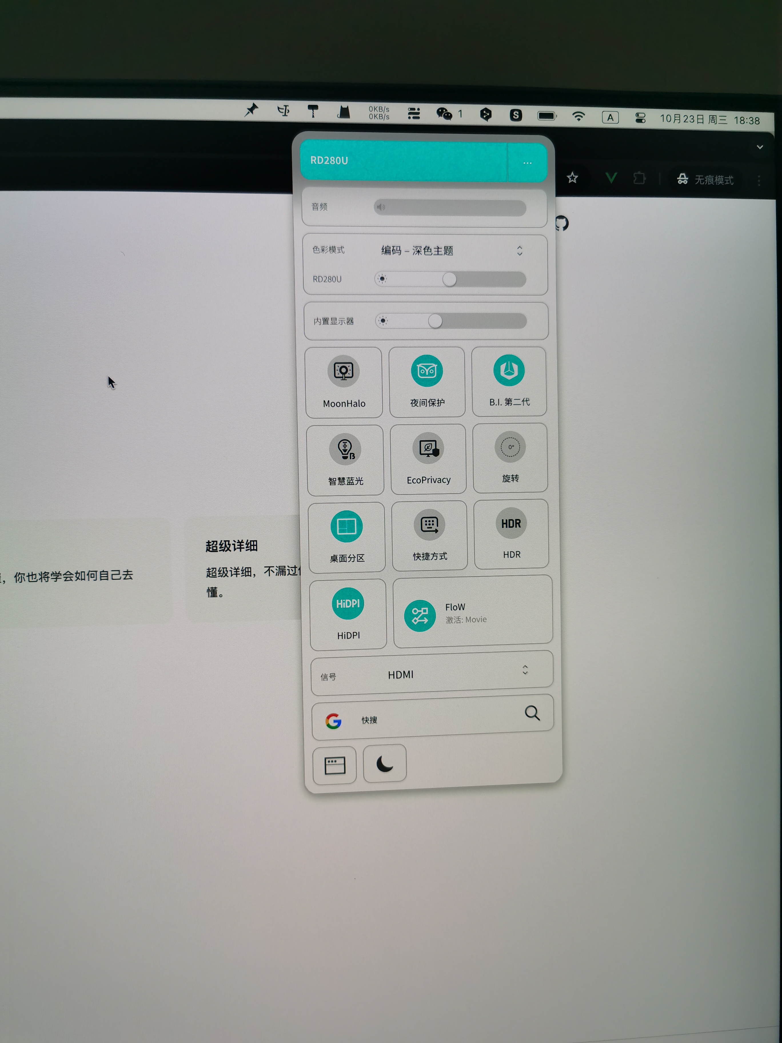 最近在研究刚买的明基RD280U显示器发现竟然还有配套的软件:Display Pilot2。这个软件不光可以直接控制显示器,比如调节亮度、切换显示模式、旋转显示器等。还可以做一些更牛逼的事情,比如欧阳最喜欢的两个功能:桌面分区和Flow。